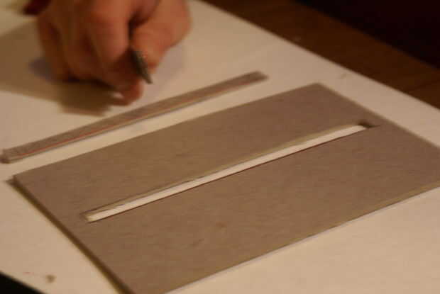 3. utilizando el cortador de la caja, con cuidado cortar el rectángulo delgado y coloque el corte pieza al lado. (por ahora)