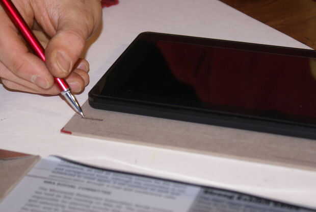 1b. Coloque su kindle en el centro del panel frontal y dibujar dos líneas, una a cada lado de la parte superior y parte inferior del kindle. Las líneas deben provenir aproximadamente 1/8" de la parte superior de la cartulina.