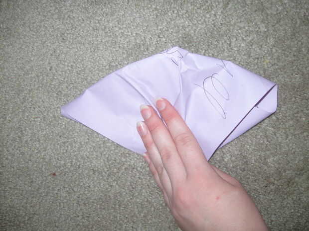 Una vez que tenga la forma que desee, recomiendo hacer un básico "patrón" para el oído para no desperdiciar tela. Tome cualquier pedazo de tela o papel de desecho y simplemente dóblela alrededor de la oreja (véase los cuadros). Corte cualquier exceso de papel, dejando a solamente un traslapo leve. Se trata de la forma básica de la pieza de tela corte-generalmente una pieza cuadrada o rectangular dependiendo de las dimensiones de la oreja.
