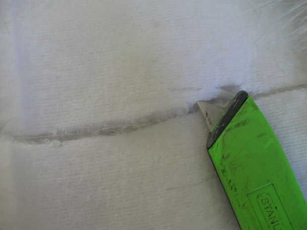 -Piel de corte, corte en la parte posterior de la piel con un cuchillo de corte de caja o de otro instrumento pala, no tijeras. Tijeras cortan la piel abajo corto alrededor de los bordes, que hace casi imposible ocultar las costuras. También hacen un lío.