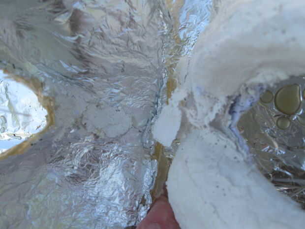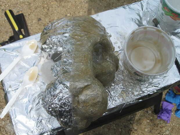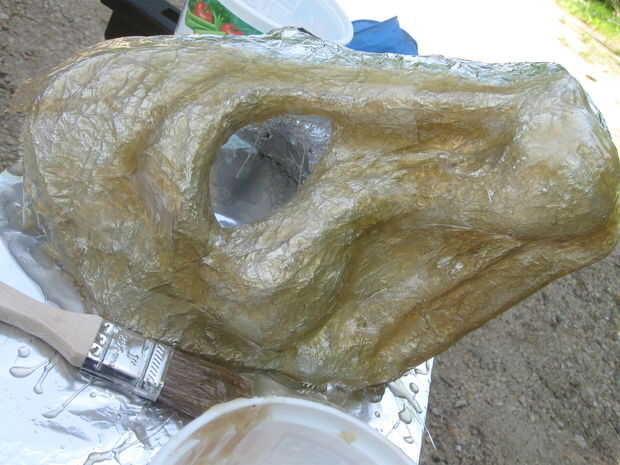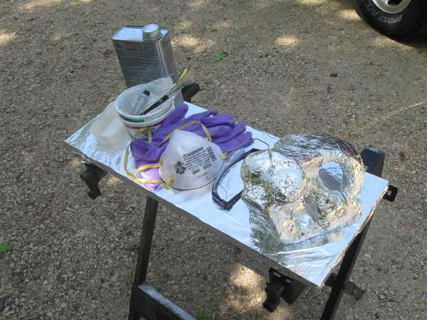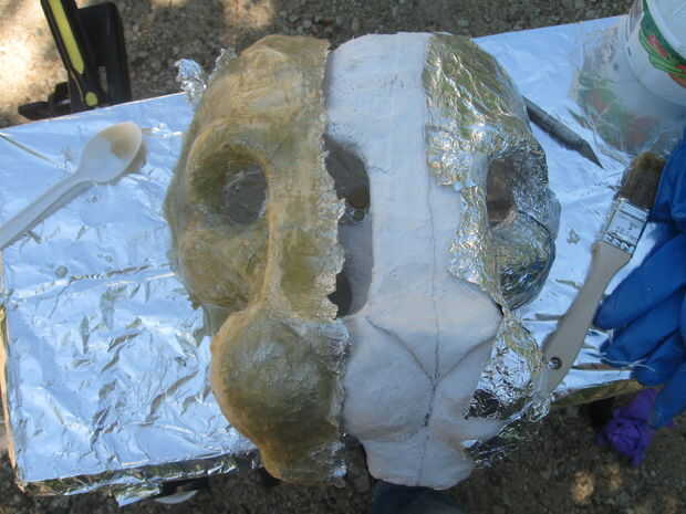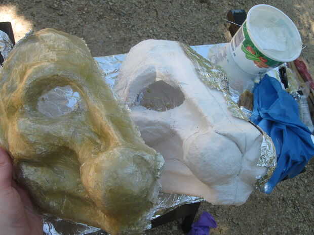 Sólo Coloque una capa de la tela de fibra de vidrio encima de la máscara en esta etapa. Más adelante se sumará una segunda capa. Cuando la resina ha curado completamente, suavemente sacarla de la mitad del molde. La mayoría de la hojalata llegará gratis con la máscara en medio sí... pero la máscara no debe pegarse al molde. Dejar el papel de la máscara, porque la segunda capa de fibra de vidrio cubrir.