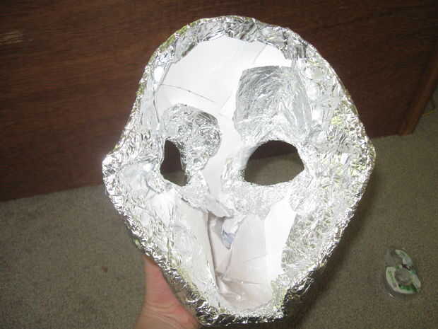 En primer lugar, cubrir el molde completamente en papel de estaño. Asoman por los agujeros del ojo y Envuélvala alrededor de los bordes. Cinta puede ayudar más planas se encuentran en zonas con curvas. Asegúrese de que todo está cubierto para evitar que la máscara se pegue al molde. A continuación, trace una línea por el centro de la máscara con un marcador, entre los ojos, la nariz y la barbilla. Esto resultará en dos mitades de la máscara que se unirán más adelante.