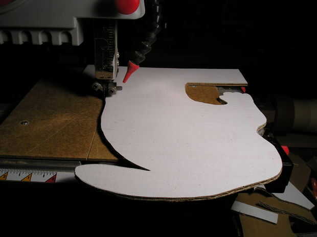 Usar una sierra de cinta es mucho más rápido. Puede utilizar una sierra de scrool, por supuesto y creo que tijeras o un cortador de la caja podría ser utilizado, solo sería más de un desafío.