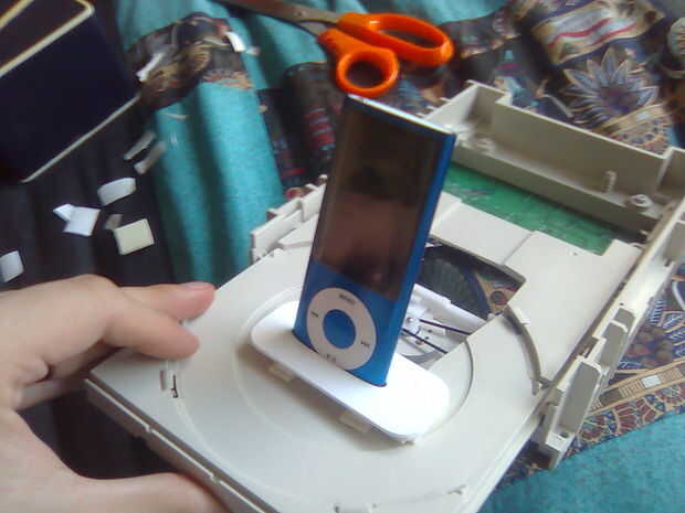 Pon tu iPod en la mitad hecha del muelle y ver cómo encaja, luego conectar el cable y el pegamento que en su lugar, simplemente no te pegamento en tu iPod. Aspiraría.