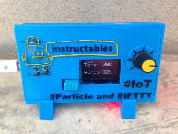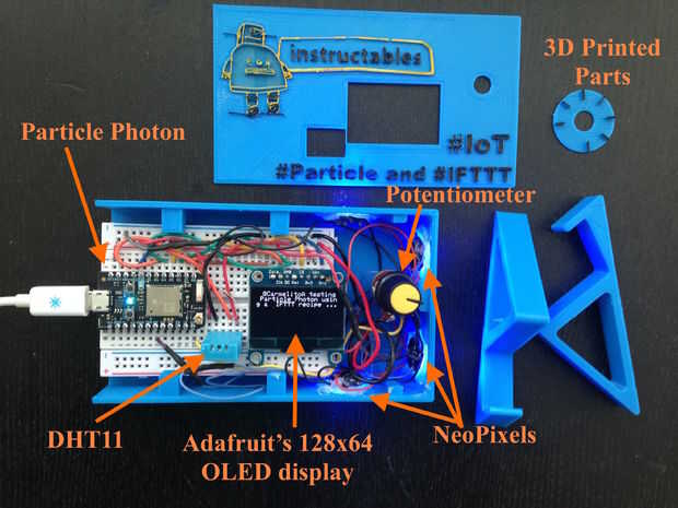 Decidí hacer un dispositivo que fue abarrotado con sensores y botones que pueden hacer lo que quieras. Tiene sensores de temperatura, humedad, gas, luz, sonido, movimiento y vibración. También tiene un altavoz y un palo de LED para la retroalimentaci