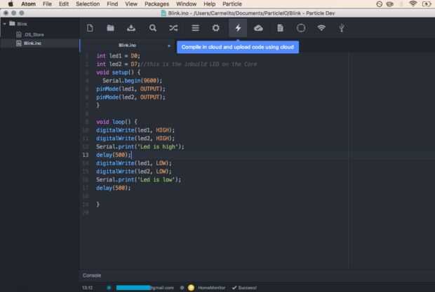 Aquí vamos a probar la configuración de su fotón con un boceto simple abrir y cerrar para comprobar si la D7 Led en el fotón