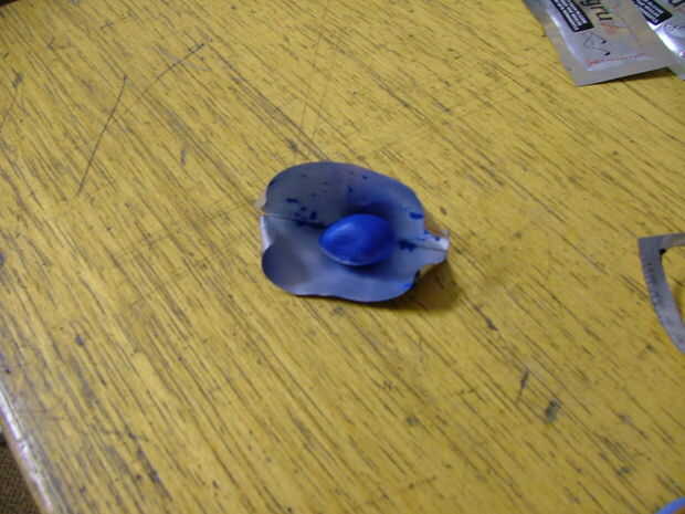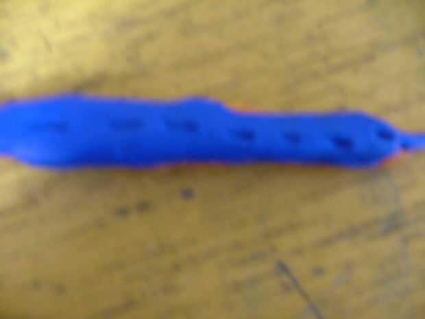 Abra la primera bolsita y cubrir el cepillo de dientes hasta el desgaste de punto que ha marcado pero deja un espacio debajo de la barriga! Entonces la otra bolsita de sugru azul y envolver la parte delantera del cuerpo. Asegúrese de que tener espacio para los dientes. Entonces utilice sus puntiagudo objeto y hacer 10mm las rajas por la parte trasera del cuerpo, se trata de las espigas.