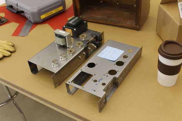 Me di cuenta en el último minuto que tenía algunos cambios a realizar en el diseño, así que tuve que cortar otra parte en el chorro de agua, y se pueden ver los dos chasis. No está demasiado mal, teniendo en cuenta. He incluido un tiro de side-by-side para mostrar la diferencia entre los dos. Observe que el primer chasis fue doblada de adentro hacia afuera. Uy. También hice la segunda prueba un poco más alto (.5 pulg.) Esto me dio un poco más espacio dentro del chasis. El transformador de salida y el rectificador de tubo intercambiar lugares, y he hecho algunos otros pequeños cambios.