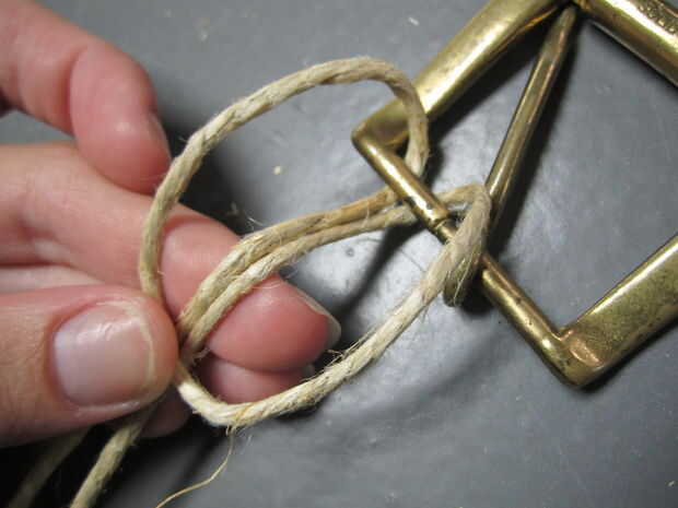 Cortar 4 hilos de cáñamo alrededor de 6 veces la longitud que usted quiere el cinturón que. Siempre es mejor conseguir más de lo necesario. Cortar la correa de la hebilla.  Luego fije una hebra a la hebilla plegable por la mitad. Pusieron el lazo debajo de la hebilla y tire de los extremos a través de. Repita con el otro filamento.