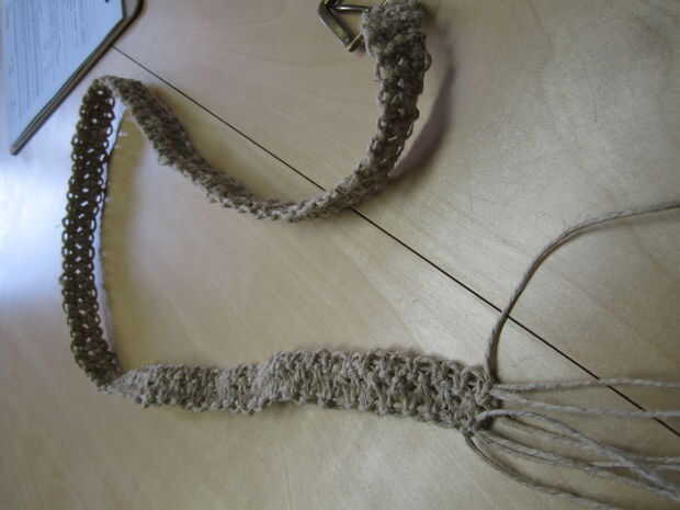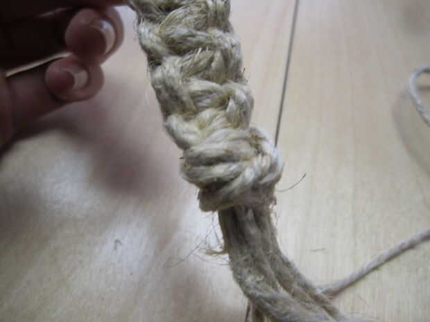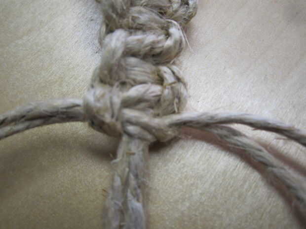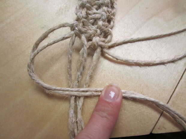 Cuando estés listo para terminar la cinta. Hacer un nudo cuadrado grande con todos los filamentos que tiene. Utilice los 4 hilos mediados como su pieza central y dos hebras de cada lado para atar los nudos.