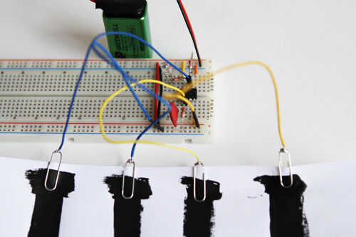 Ahora puede conectarlos a sus toque los botones usando los extremos del clip de los cables. Conecte los cables azul a su botón de ON y sus cables amarillos a tu botón de apagado. Ahora simplemente puede colocar el dedo, pulgar u otra parte del cuerpo en el espacio a controlar LED! Es así de simple!