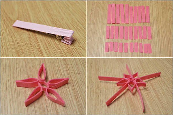 3 º, cortar una tira corta de fieltro, enlacen y coser los extremos como centro. Doblar todas las tiras de 5cm largo por la mitad y coser ambos extremos. Colocar estas tiras dobladas alrededor de la tira de centro con su extremos hacia el exterior. Parece una flor. Coser las tiras con la tira de centro para asegurar;