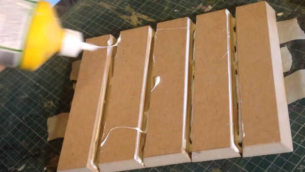 Que alineados todos a cinco tablones de lado a lado y pegado con cinta de enmascarar. Luego volcó todo y agrega el pegamento. He hecho la curva y grabado juntos, ver imagen. Luego añade los dos lados y afianzado con abrazadera.