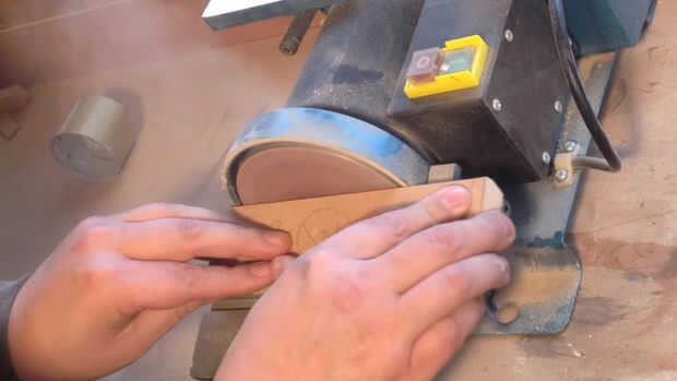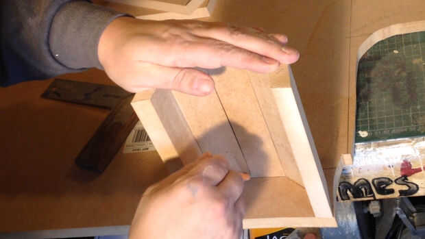 Con MDF de 18 mm medidas y cortar 5 x 20 x 5 cm. Marqué y lija en cada lado en un ángulo, solo comentar el ángulo hasta que lo conseguí (es como me gusta trabajar)