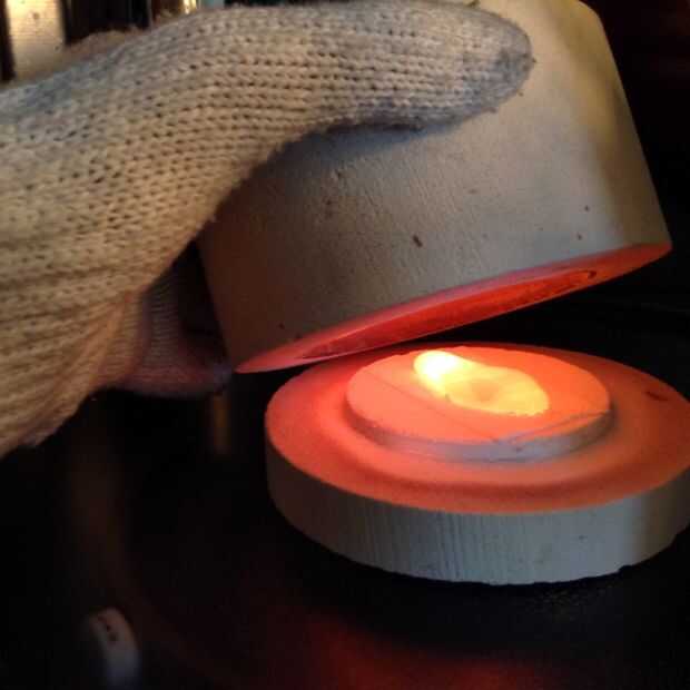 Una vez que comience el proceso de fusión, la temperatura dentro del horno se levanta rápidamente y le note un resplandor rojo brillante de la parte superior del horno (de la mirilla del horno). Esto significa que ahora las piezas de vidrio se han convertido en suaves y fusión con los demás.