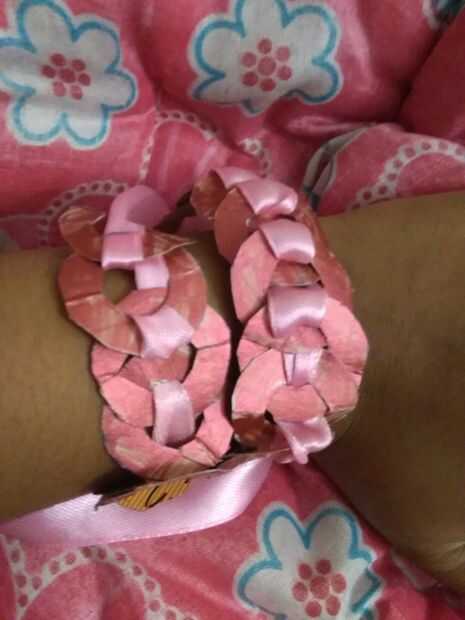 Así que primeramente tome collar arandela y envolver en la mano (dependen de su collar) y lazo en tu hand.this hacer tu pulsera.