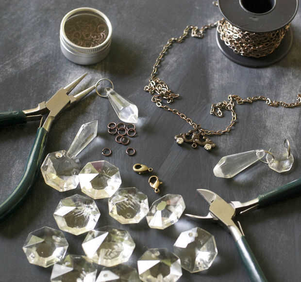 Se reúnen a sus alicates, cadena, salto anillo y broche.  Si tienes cuentas o resultados, usar epoxi para sujetar el cristal.  Corte una longitud de cadena y coloque un anillo de saltar a un extremo y un cierre a otro.  Inserte un anillo del salto en el agujero en la parte superior del cristal.  Enrosque en la cadena y tiene un collar de gran declaración.