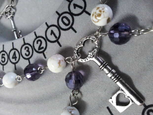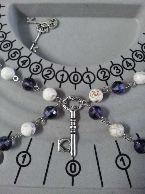 Vamos a conectar un extremo de los filamentos más pequeños a cada uno de los anillos del salto que acaba de poner en el encanto clave (las mismas que el collar principal se une a), aunque vamos a colocar debajo de la otra cadena. Esto podría significar en frente o detrás o incluso por debajo, dependiendo de lo que parece su encanto. Lo que importa al final del día es que usted coloque sus filamentos en la misma posición en cada bucle.