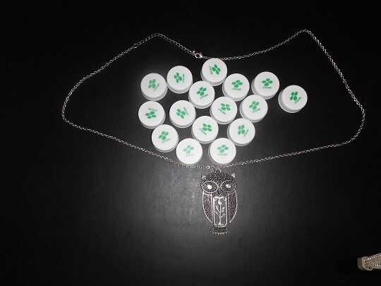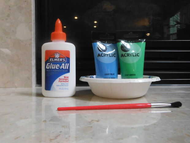 cadena de barato (yo tengo la mía de Walmart por $5), botella 16 tapas preferentemente del mismo tamaño y color, arte pegamento, pintura acrílica azul luz, hoja pintura acrílica verde, un taladro, una broca de 3/16 de pulgada, un recipiente y un pincel pequeño. Estos materiales me costó que no más de $10 y la pintura de acrílico se pueden encontrar fácilmente en la sección de arte de Walmart. Si desea utilizar colores diferentes además de azul claro y la hoja verde no dude de hacerlo.
