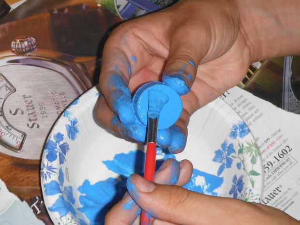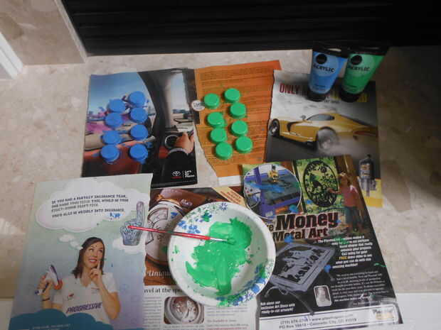 Exprimir un color de pintura acrílica en el tazón de fuente y usando el pincel con cuidado y uniformemente la pintura 8 de los 16 cápsulas. Lave el pincel pintura y tazón de fuente para repetir el proceso con el otro color. Tu probablemente va a llegar un poco "colorido" así establece unas hojas de papel antes de empezar a pintar. Deje los tapones de botellas pintadas secar durante 24 horas.