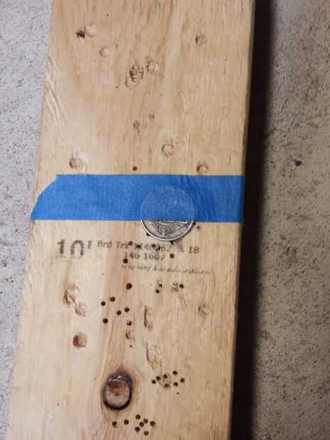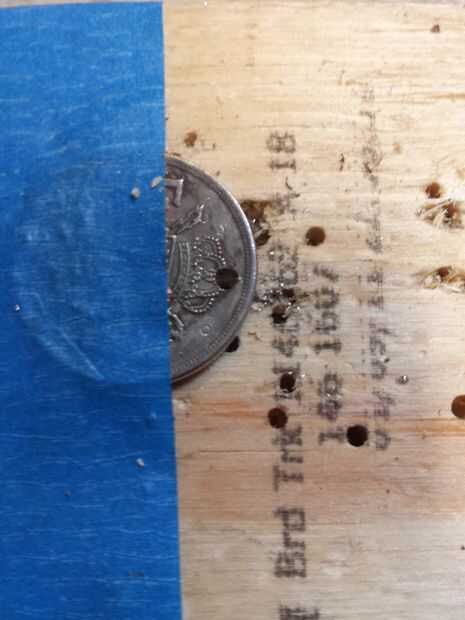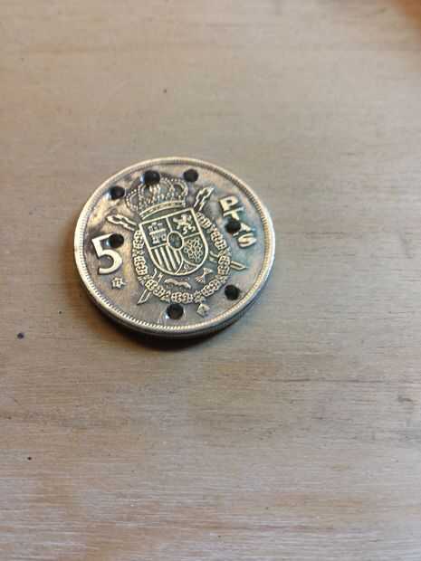 Me Coloque la moneda en un trozo de madera y cinta hacia abajo para evitar mucho movimiento. Poco a poco traer el taladro sobre la marca de punzón aumenta la velocidad como se pone más en la moneda. Hacer esto para todas las marcas de punzón y tendrás algo parecido a la foto de arriba.