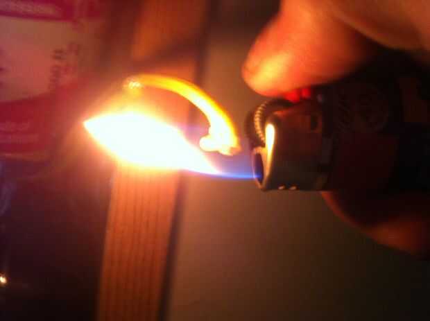 Necesitará dos colores juntos en los extremos del fusible antes de empezar a atar. Para hacer esto debe mantenerlos en la mano y calentar uniformemente hasta que empiecen a derretir en un blob. El paracord se celebrara en la sección azulde la llama para que no encender fuego y negro.