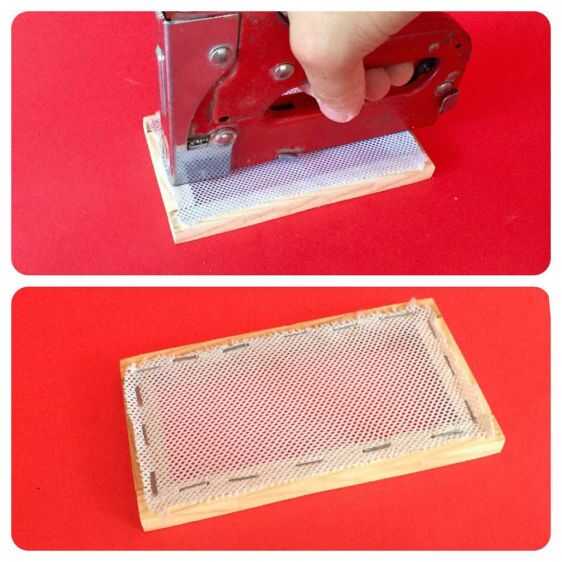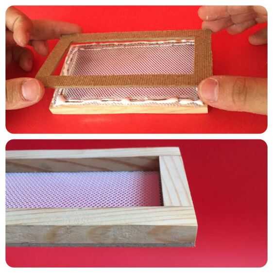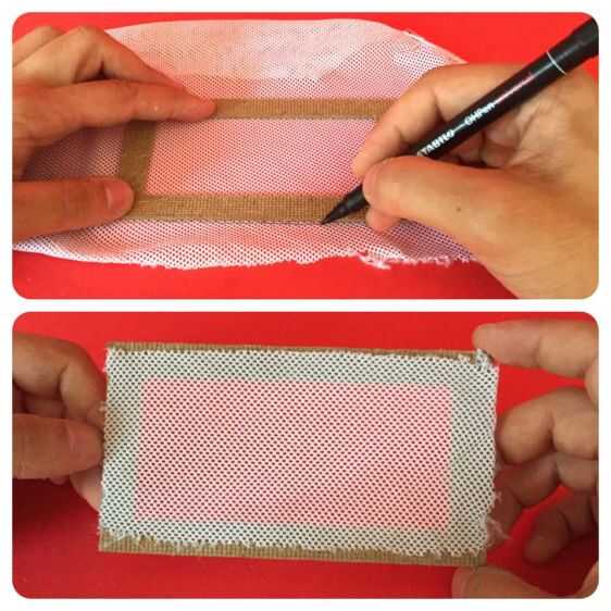(Puesto que utiliza todos los materiales de desecho, recorta el marco de rectángulo de la base de una caja de fresas madera, y como pantalla utilicé uno que estaba dentro de un viejo traje de baño que nunca usé)