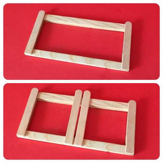 Solicité una pequeña cantidad de pegamento para madera en cada pieza, y apreto en el rectángulo de respaldo durante unos segundos. Empecé con el 2 palitos externos y luego pegué 2 los centrales.