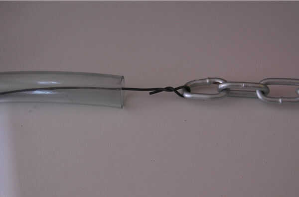 -Atar el alambre de acero o balas a través de un eslabón de la cadena y el cable a través de una sola pieza de manguera o tubería de alimentación. Con el cable tire de la cadena a través del tubo hasta el final de la cadena aparece al otro lado de la manguera (se requieren dos personas o atar el cable apagado algo robusto para que pueda tirar contra él). Desatar el alambre de acero.