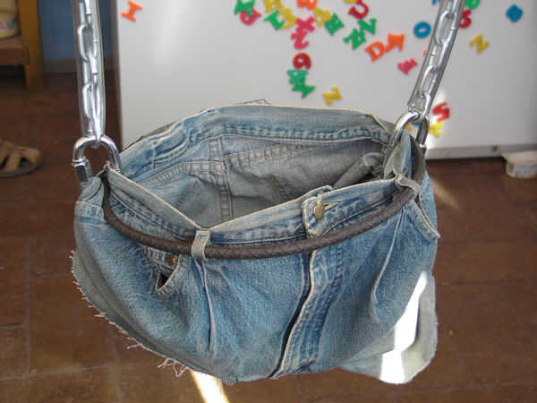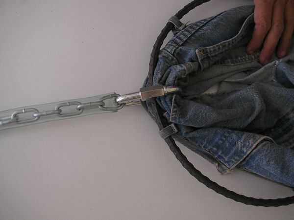 -Coloque un extremo de un 3/8" cadena enlace rápido a través de una pierna de los pantalones vaqueros y alrededor de la varilla, agrupar el tejido interior del eslabón. Dejo el link de cadena abierta.