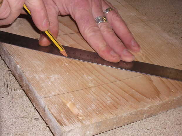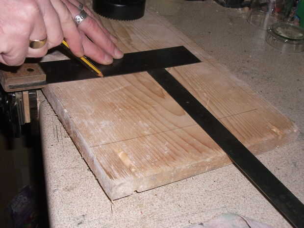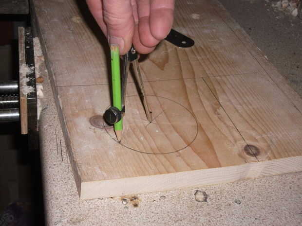 Esto es madera blanda de 20mm de un estante viejo, aunque la madera es obviamente mejor. Encuentre el centro dibujando líneas de esquina a esquina y marcar un rectángulo 160 x 140 mm de la marca donde se cruzan. Use un compás para marcar un círculo de diámetro 90mm