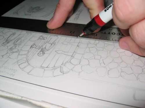 Una vez que he vuelto a montar mis plumas y les consigue trabajo, tomo mi pluma más ancha y utilizar la regla para dibujar los contenedores de marco. Aquí es donde es importante el corcho en la regla. Porque levanta el borde de la regla el papel, la tinta no sumerja debajo del borde de la regla mediante acción capilar y arruinar sus líneas. Esto es importante - no pase el plumas de tinta de cualquier tipo a lo largo del borde de una regla que se encuentra al ras en el papel. La tinta se sumerja debajo de la regla, y usted será probablemente Haz manchado líneas al mover la forma lejos el papel de gobernante. Puede ser fija, pero mejor no tener que lidiar con él.