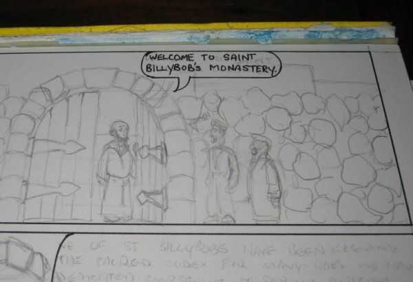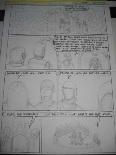Normalmente escojo una sección del papel para escribir en mi nombre, mi autor co-, el nombre del estudio y la fecha de la historieta. No hacerlo aquí porque no tengo suficiente espacio en esta página, y no sé qué fecha espero publicar este comic ahora mismo. Te agrego estos detalles en la segunda parte de este tutorial, cuando hago la manipulación digital de imágenes para preparar al cómic para su publicación.