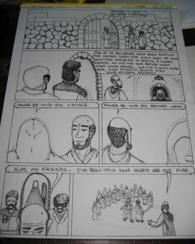 El siguiente paso es utilizar los diversos corrales de grueso tengo que completar el entintado. Generalmente dibujaré elementos en primer plano primero y con líneas más gruesas que artículos más de fondo. Yo uso el lápiz más grueso que puedo conseguir lejos con dibujar ningún detalle particular. Para imágenes en primer plano puedo usar bolígrafos gruesos contornos y líneas más finas para trabajo de detalle. Objetos o escenas que son más distante o menos intrincadas que hacer con las plumas más finas. Generalmente usaré 3 espesores de pluma en una sola página, no más o se convierte en demasiado trabajo.