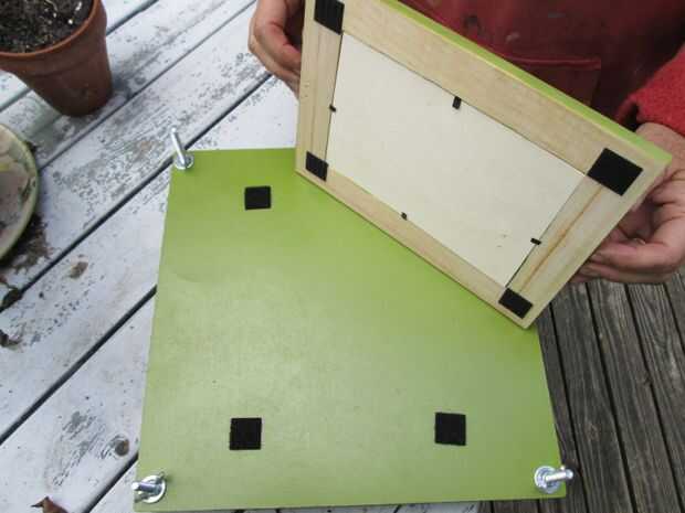 Utilice cuatro cuadrados de Velcro adhesivo para unir el marco con su ejemplar a la parte superior de la prensa de la planta.