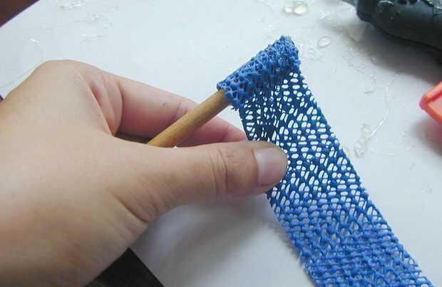 Corte otra tira de 3 cm ancho de la estera antirresbaladiza y envuelva alrededor uno inclínelo hasta alcanzar el otro extremo, luego péguelo. Enrolle otra tira alrededor de la inclínelo una vez más, a partir del extremo opuesto.