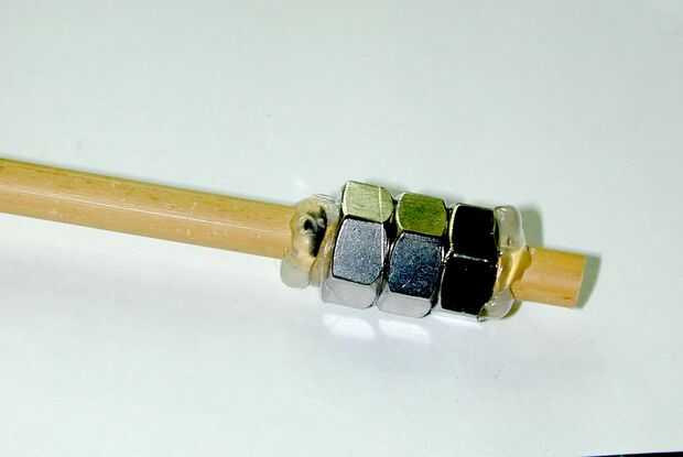 Compruebe el equilibrio de la palanca de la flor; su centro de gravedad debe ser justo en el punto medio de la palanca. Si no, pegar las arandelas en el extremo más ligero hasta que el palillo esté equilibrado.