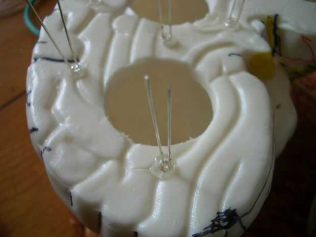 He perforado varios agujeros de 5mm y caliente pegar la LED´s al azar en su lugar, les soldadas a las resistencias y los cables negros.