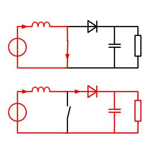 • Cuando el interruptor está cerrado (primer diagrama), conecta un inductor en la entrada de voltaje mientras que el diodo bloquea la corriente fluya desde el lado de salida.