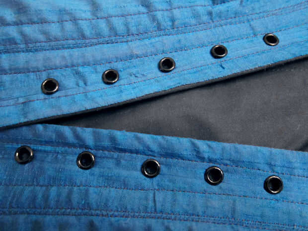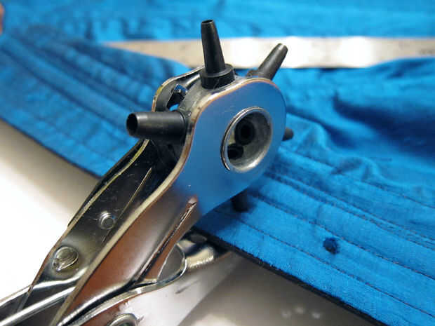 Inserte sus ojales en los agujeros, que estén en limpio. Voltee a la tela y utilizando una herramienta de ojete, martillo en su lugar.