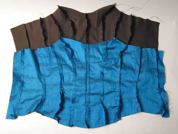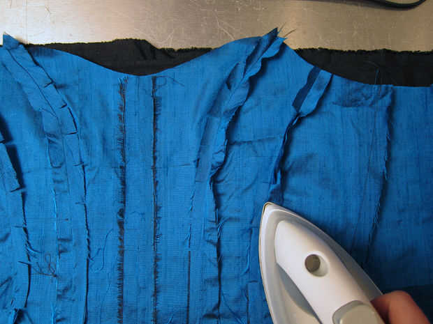 Una vez que ambos se completan, clip las costuras según sea necesario en la cintura y busto y hierro plano.  Es importante para ambos, para que no te extraños pliegues y bultos al coser los canales.