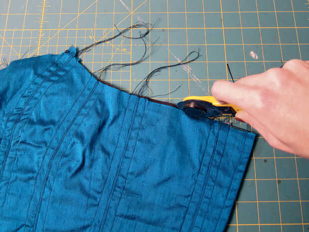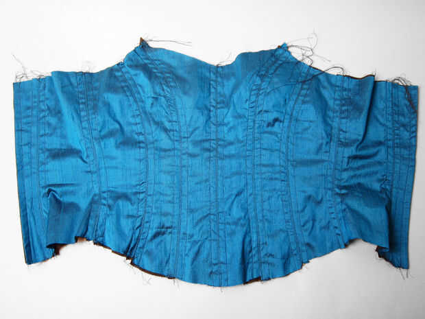 En este corsé, tengo un hueso a cada lado de cada costura, más una a lo largo de la parte posterior de cada lado. Generalmente comienzo en medio del corsé y trabajar en ambas direcciones hacia la parte posterior, por lo que si hay cualquier discrepancia en cómo se alinean las costuras será incluso vs trabajo de un lado a otro.