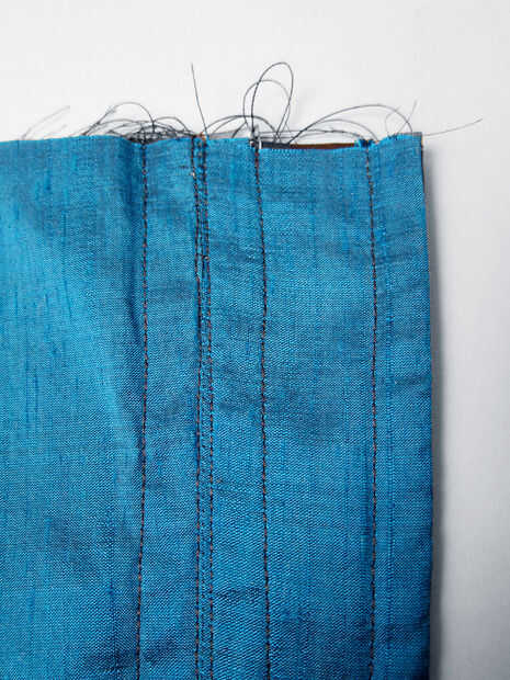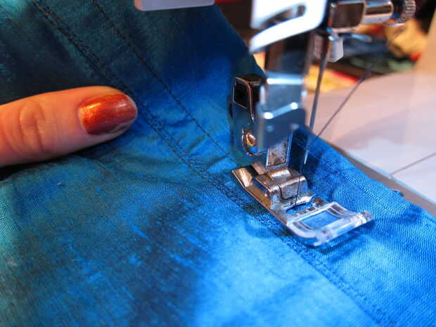 Para cada línea de la costura, primero se debe coser una costura justo al lado de la línea de costura a cada lado, tan cerca como sea posible.  Coser la primera de estas costuras lentamente, asegurándose de que la línea de costura de la exterior y forro de tela se alinean perfectamente como sea posible.  Generalmente puedo decir son alineados por la sensación, pero si usted encuentra esto difícil entonces querrá prender primero sus costuras.