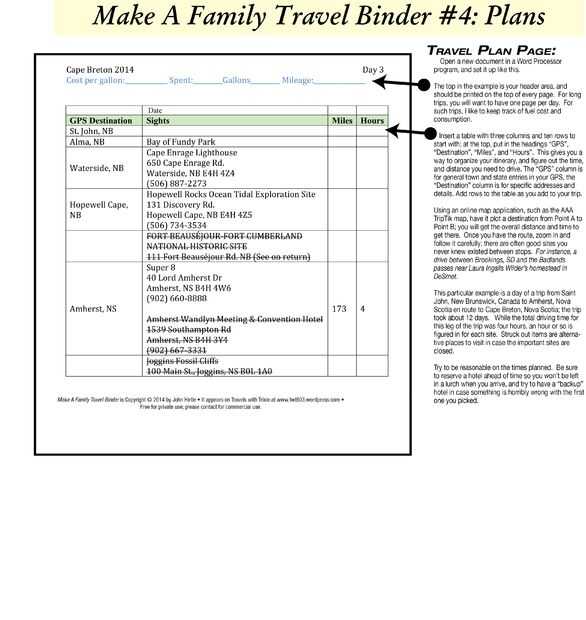 Este ejemplo en particular es un día de un viaje desde San Juan, Nuevo Brunswick, Canadá a Amherst, Nueva Escocia en el camino a Cape Breton, Nueva Escocia; el viaje tomó cerca de 12 días. Mientras que el total de tiempo para esta etapa del viaje fue de cuatro horas, una hora más o menos es figurado en cada sitio. Ponchó a artículos son lugares alternativos en caso de que los sitios importantes están cerrados.