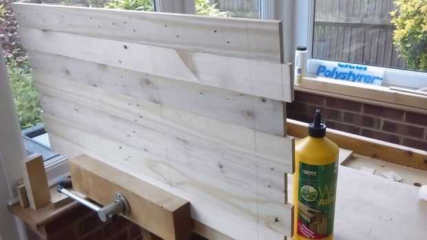 Para mantener los paneles planos mientras seca el pegamento, ya sea utilizar bornes (como tengo en la foto), cauls fijadas a través de la superficie de sujeción o descansar el panel sobre una superficie plana y aplicar pesos a él (uso de plástico, etc. para evitar que se pegue a la superficie o pesos).