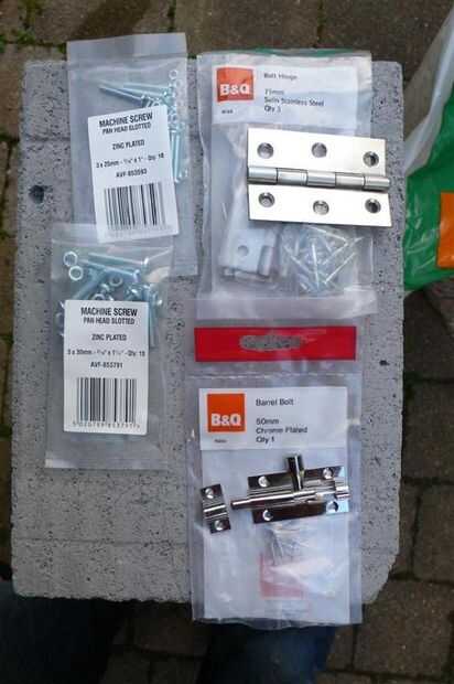 4) tornillos de máquina para montar las bisagras y perno. (3) Opté por usar tornillos y tuercas porque el plástico de lo compartimiento del wheelie es muy suave y me preocupaba los tornillos no roscar correctamente