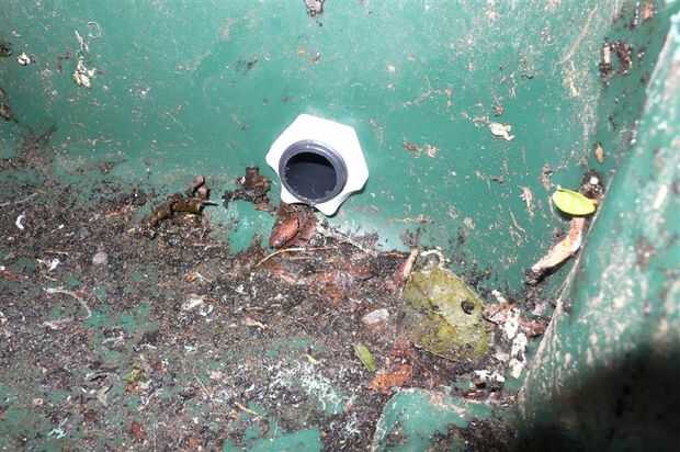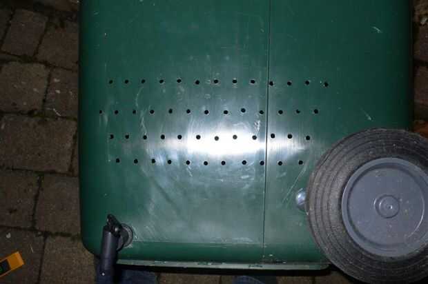 Para fomentar la circulación de aire a través de la compostera y evitar bacterias anaerobias malolientes ser taladro dominante una carga de agujeros en el lado y la parte posterior de la papelera, marcar hacia fuera y perforar hacia fuera cuidadosamente para que se vea bonito.