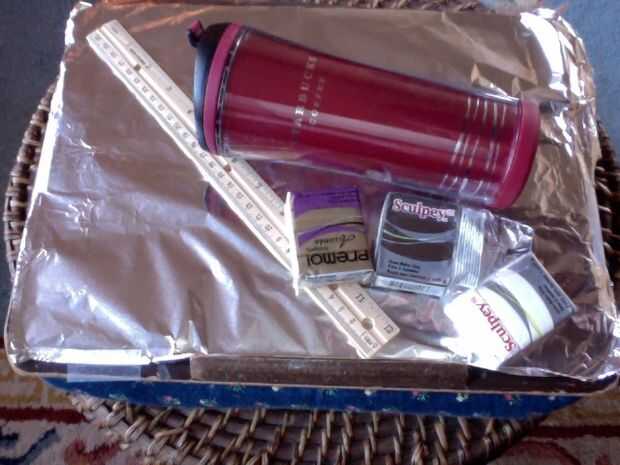 Esta arcilla pega a cualquier cosa muy fácilmente, así que si usted puede encontrar una superficie de mármol o vidrio, utiliza. No tengo ninguno, así que puede poner papel de aluminio sobre un portapapeles o algo y trabajar en eso. (A veces las lágrimas, pero es k.)