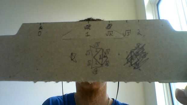 El número fundamental necesita es 1, sqrt(2) ~ = 1.414 y sqrt(3) ~ = 1.732. Los números 2 y 2*sqrt(2) ~ = 2.828 voluntad también ver para arriba, pero no es absolutamente necesario que en la regla. Para hacer este gobernante improvisado, me basé en el famoso teorema de Pitágoras, a ^ 2 + b ^ 2 = c ^ 2. Si tienes un triángulo rectángulo con las piernas de longitudes 1 y 1, la diagonal es sqrt(2). Si tienes un triángulo rectángulo con las piernas de longitudes 1 y sqrt(2), la diagonal es sqrt(3).