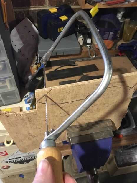 Salir de una sierra de marquetería o vio otra hoja delgada y recortarlo. Le ahorrará mucho tiempo hacerlo con madera, en lugar de tratar de afinar y ajustar la forma una vez que usted ha cortado fuera del metal más tarde.
